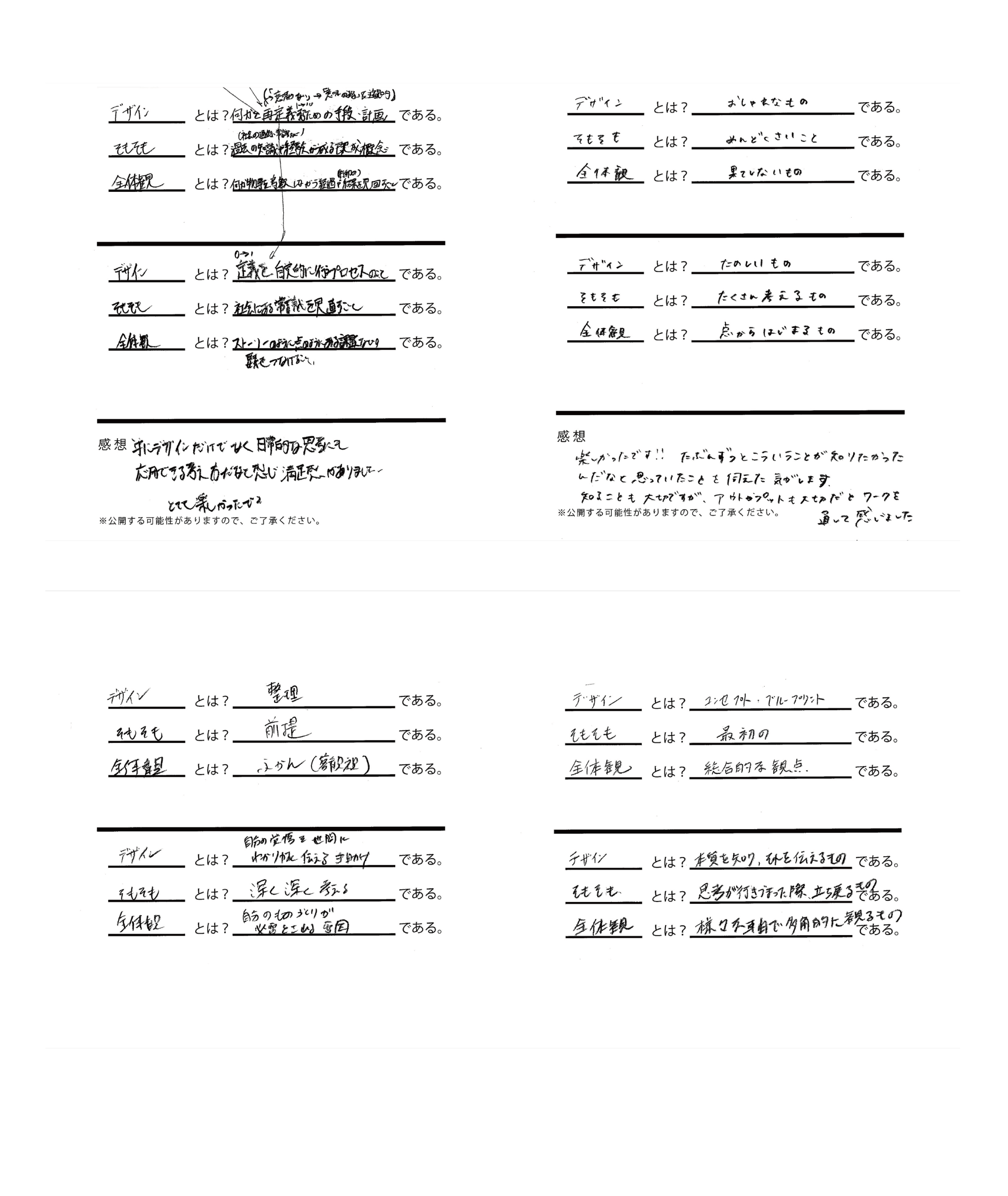 「自分は何のためにデザインをするか。」のお題で、考えを紙に書き出してもらいました。