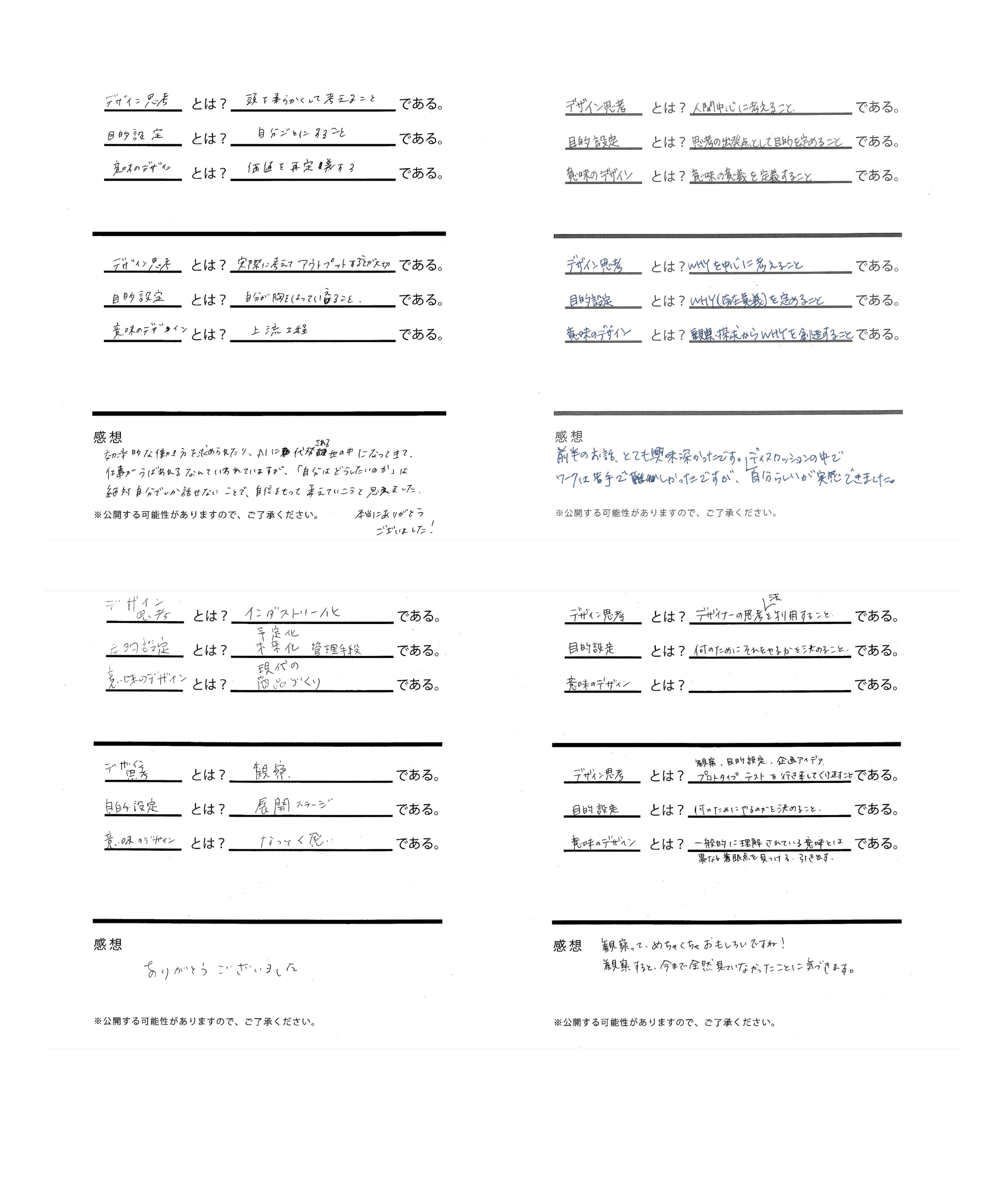 • 初めての参加で、デザインの考え方を実践してみたら難しいなと思った。生活でも実践していきたい。